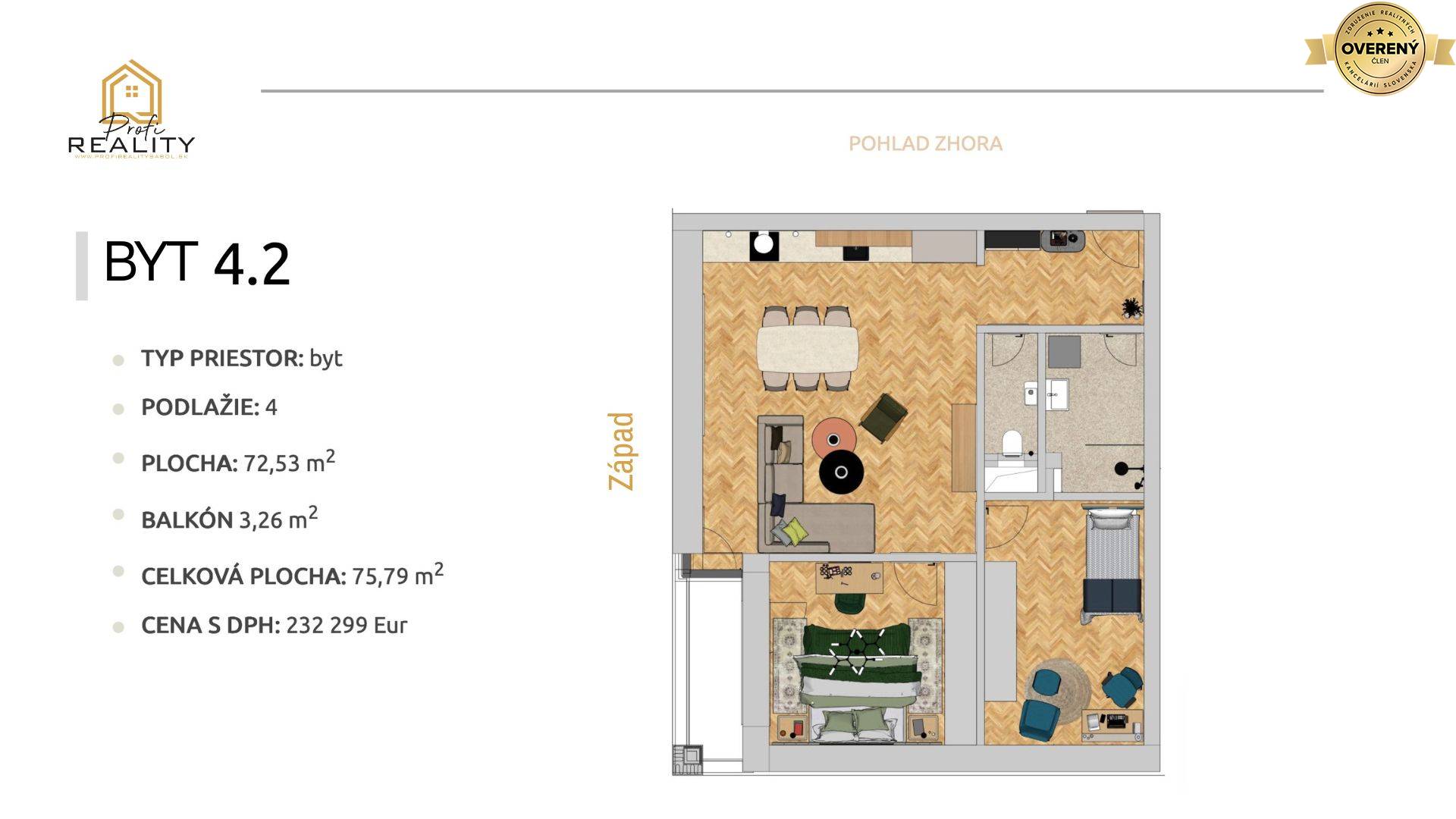Byt 4.2 – 4. podlažie. Výmera: 72,53 m² + balkón 3,26 m² (spolu 75,79 m²). Cena: 232 299 € s DPH