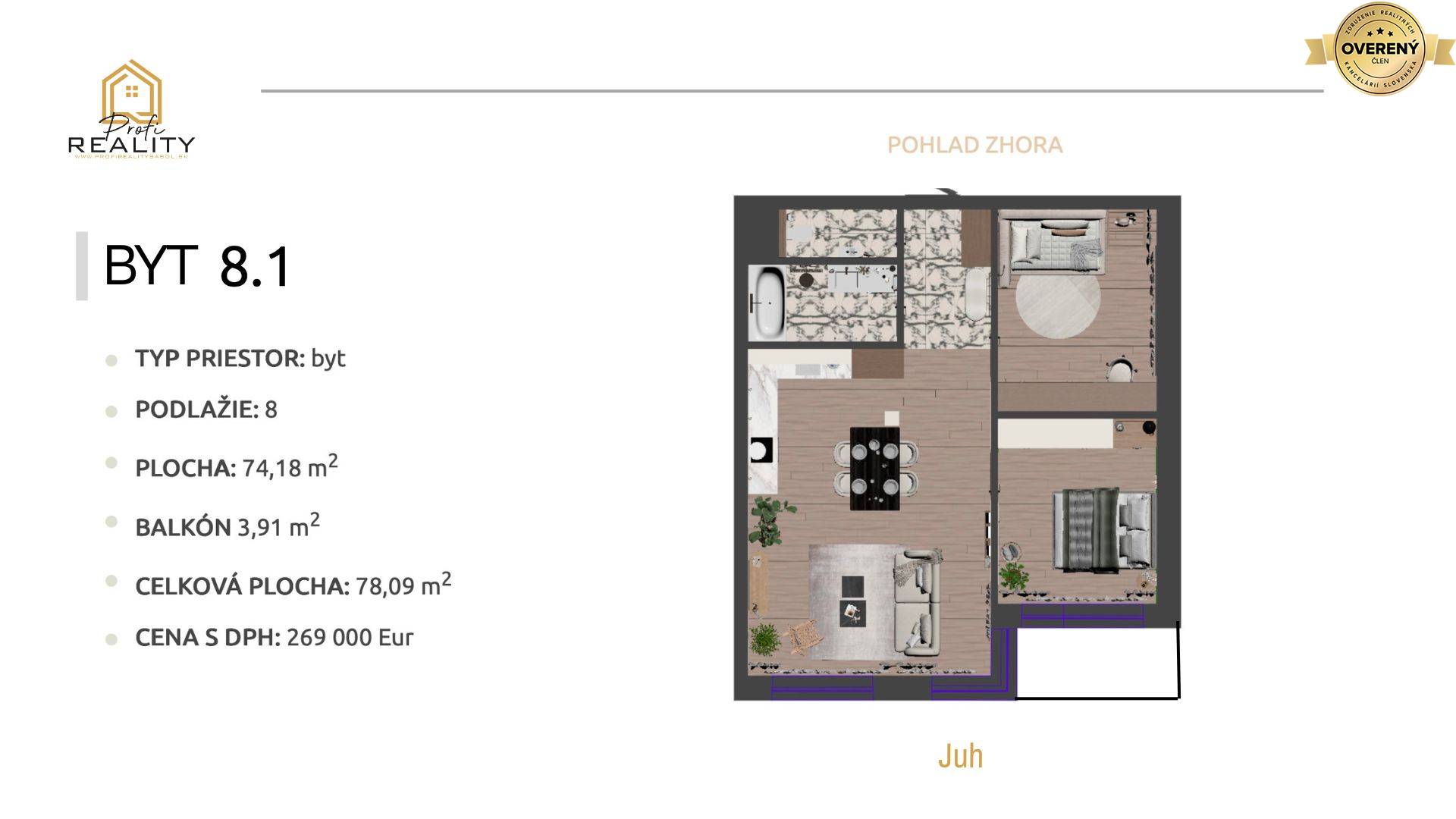 Byt 8.1 – 8. podlažie. Výmera: 74,18 m² + balkón 3,91 m² (spolu 78,09 m²). Cena: 269 000 € s DPH