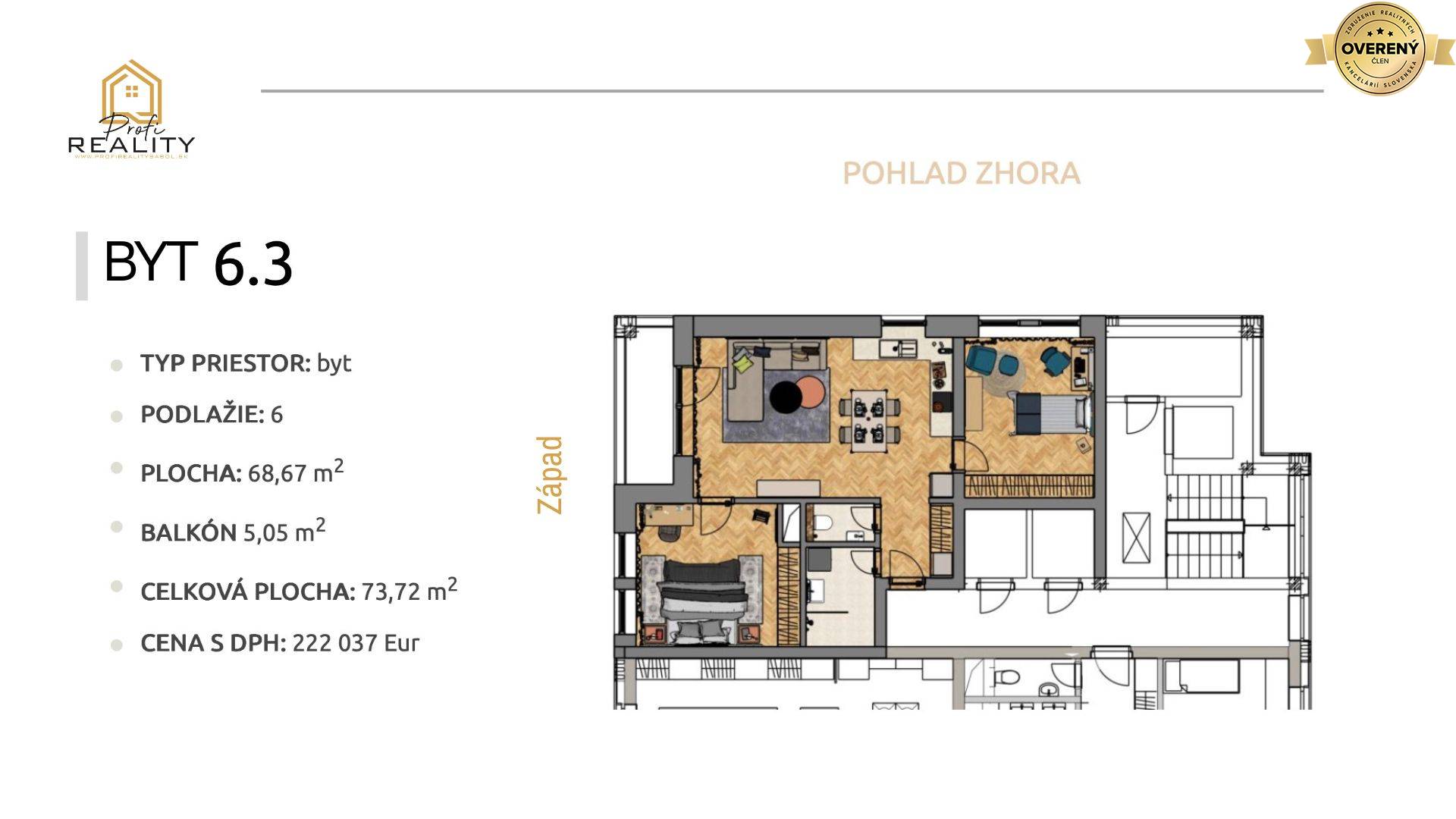 Byt 6.3 – 6. podlažie. Výmera: 68,67 m² + balkón 5,05 m² (spolu 73,72 m²). Cena: 222 037 € s DPH