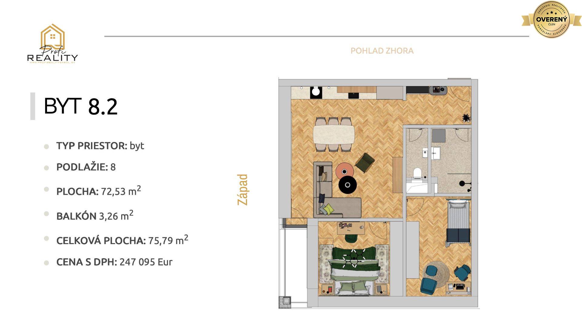 Byt 8.2 – 8. podlažie. Výmera: 72,53 m² + balkón 3,26 m² (spolu 75,79 m²). Cena: 247 095 € s DPH