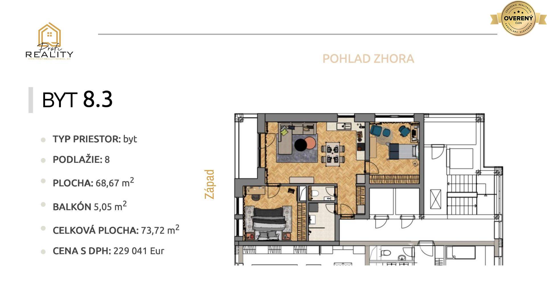 Byt 8.3 – 8. podlažie. Výmera: 68,67 m² + balkón 5,05 m² (spolu 73,72 m²). Cena: 229 041 € s DPH